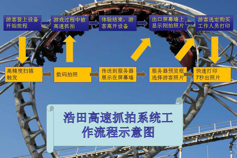 自動檢測 → 觸發(fā)并拍攝 → 自動傳輸→ 終端自動讀取照片信息→屏幕顯示→游客下車后瀏覽照片 → 游客做出選擇 → 自動打印 → 領(lǐng)取包裝照片