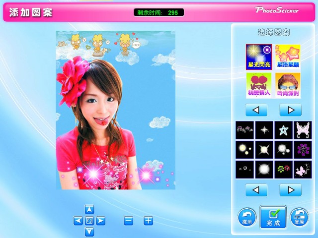 在右側(cè)面板上方選擇“圖案”類別,在其下方選擇喜歡的圖案,在左側(cè)的照片預(yù)覽中點(diǎn)擊添加圖案。另外可使用照片預(yù)覽底部的功能按鈕進(jìn)行移動(dòng)和縮放圖案。