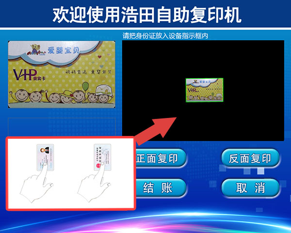 浩田自助二代身份證打印機可以進行二代身份證快速復印、掃描復印和讀卡器復印,可以微信、支付寶、投幣支付,投放在地鐵、機場、車站、辦證大廳、銀行、學校等人流密集地