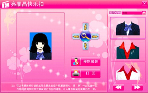 拍照完成后按“保存”鍵,會(huì)自動(dòng)進(jìn)入換裝界面,通過遙控器上的“放大/縮小”“左旋/右旋”鍵調(diào)節(jié)衣服的大小以及方向。若要打印,可直接點(diǎn)擊打印,若要退出重照,則點(diǎn)擊右上角的“”可退出換裝界面。